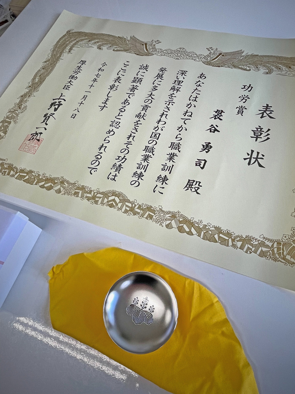 このたび当社会長の 袰谷勇司 が、国から 職業訓練功労者 として 厚生労働大臣表彰 をいただきました。